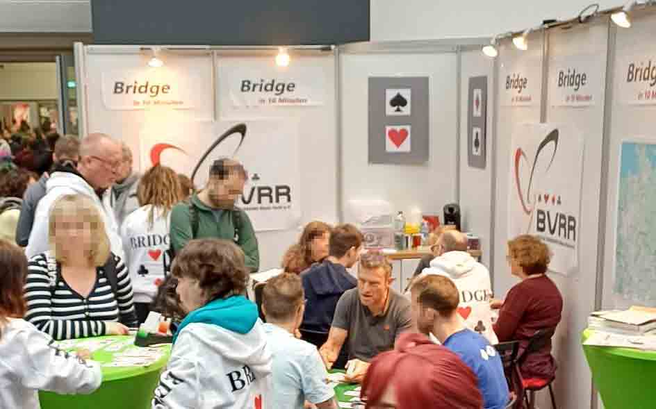 Im Vorfeld der Messe hat Vera Kröger nach Anfängerkursangeboten von den Vereinen des BVRR recherchiert. So konnten einige Begeisterte direkt zu Anfängerkursen vermittelt werden. Sehr hilfreich war hier eine Karte mit allen Mitglieder-Clubs vom BVRR. Es konnte direkt gezeigt werden an wie vielen Orten Bridge gespielt wird. Interessierte, die nicht aus unserem Bereich kamen, wurden das Online-Spiel und Unterricht erklärt oder an den DBV verwiesen.